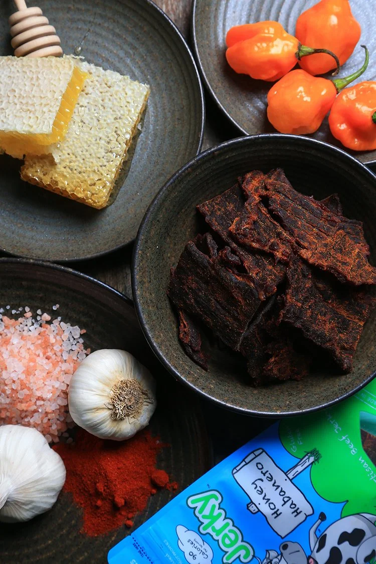 photo of genius jerky showing ingredients of honey, peppers, garlic in studio shot by whysall photography